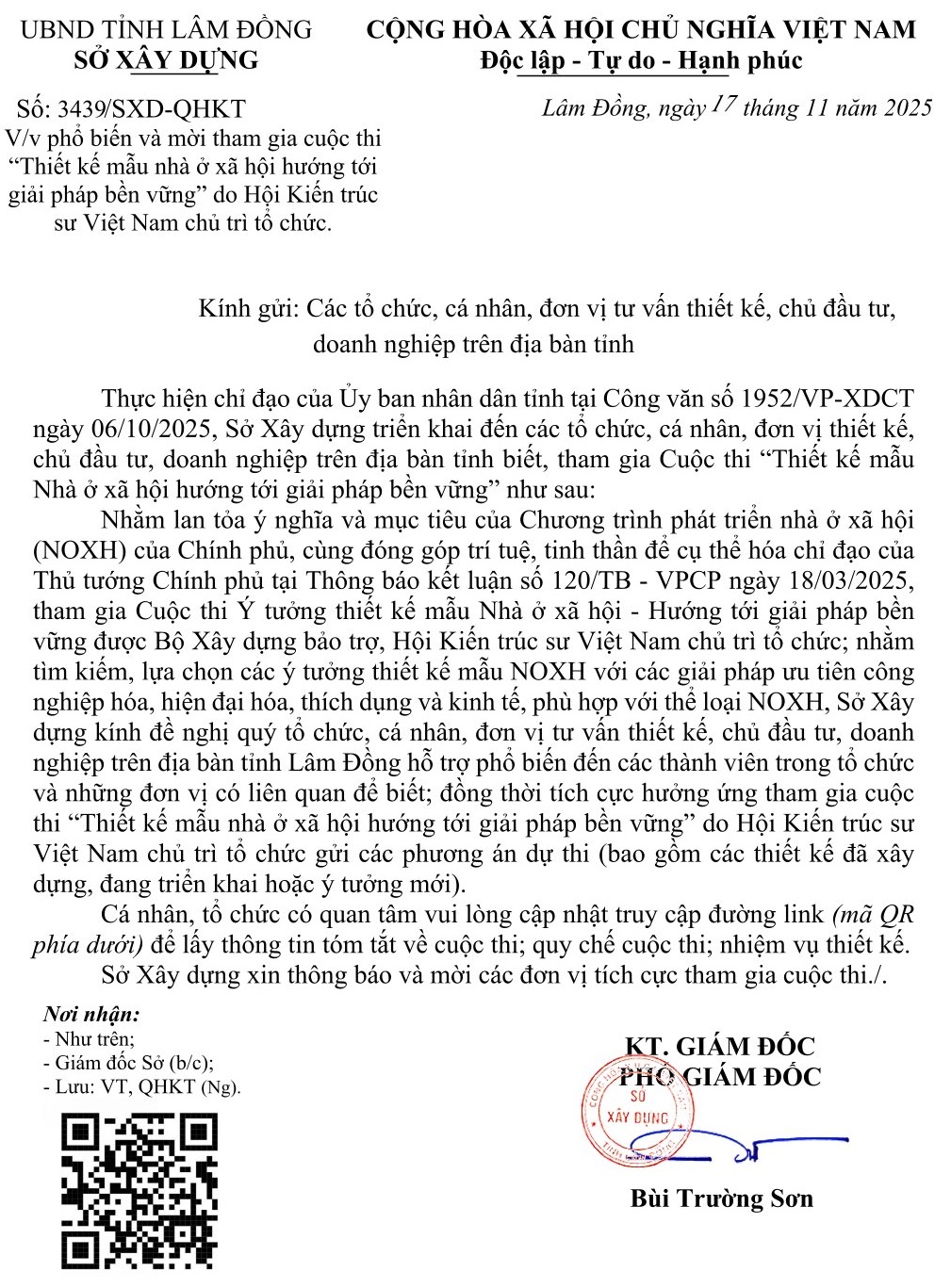 Sở Xây dựng tỉnh Lâm Đồng phổ biến và mời tham gia cuộc thi "Thiết kế mẫu nhà ở xã hội hướng tới giải pháp bền vững" [18/11/2025]