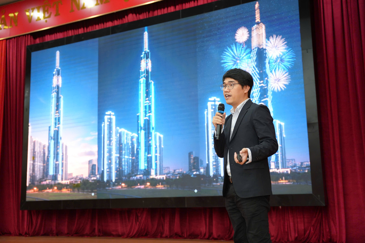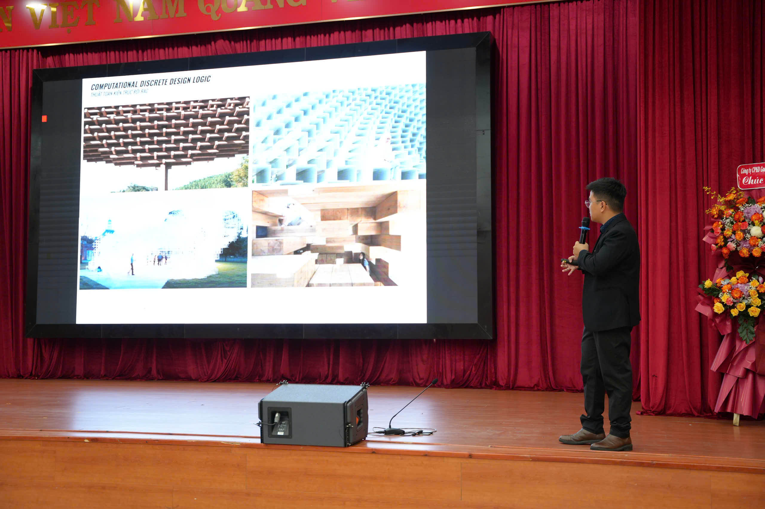 - ThS.KTS. Lục Bá Phúc Hưng (Darkhorse Architecture, AI+Design VN) với báo cáo “Ứng dụng trí tuệ nhân tạo trong thiết kế kiến trúc xanh – từ tiềm năng đến khả năng thực tế”. Ông nhấn mạnh sự cân bằng giữa AI và kỹ năng con người, đồng thời khẳng định vai trò thiết yếu của yếu tố xã hội, văn hóa và đạo đức trong các giải pháp thiết kế bền vững.